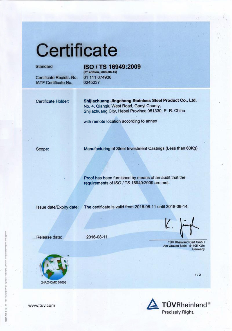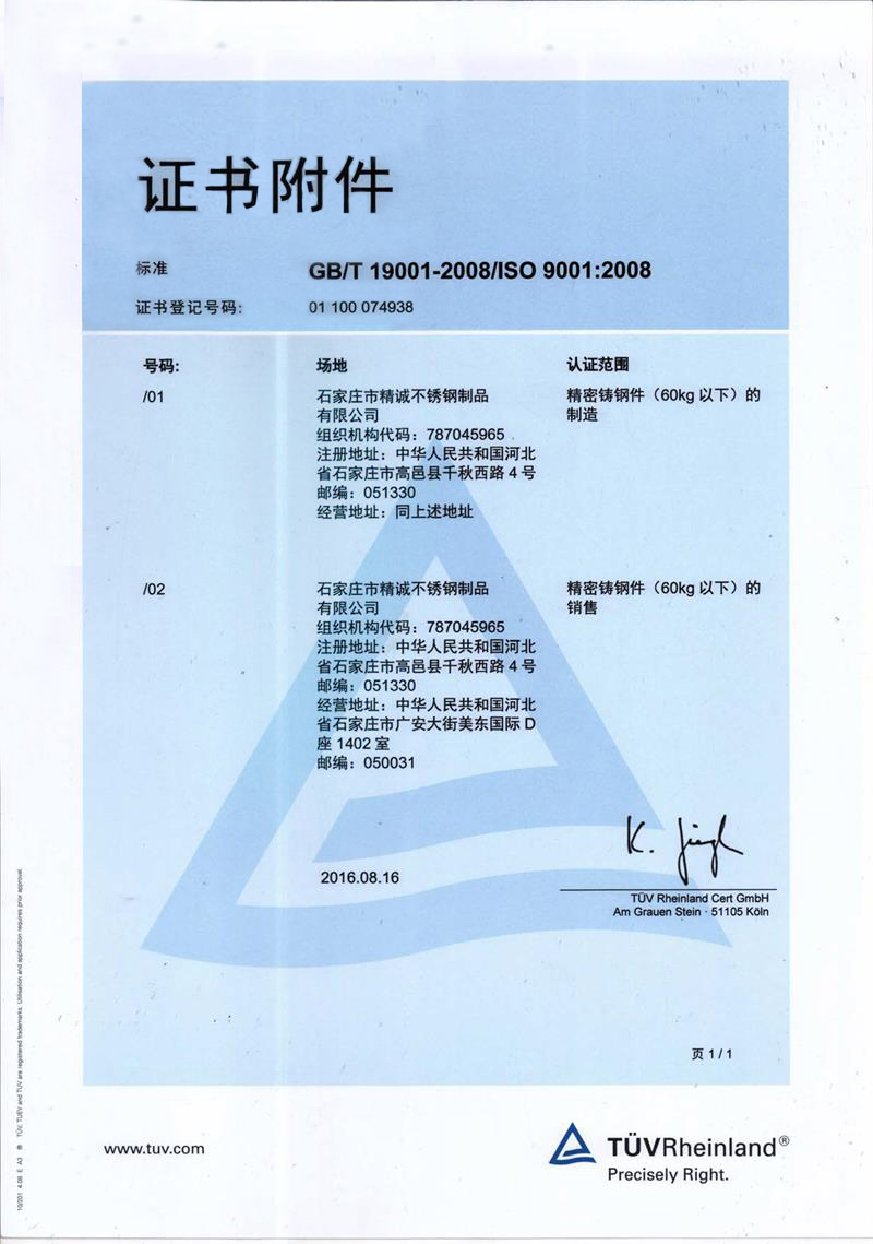 Shijiazhuang Jingcheng Stainless Steel Products Co., Ltd. is a professional precision casting enterprise. It mainly produces precision castings and processed products of stainless steel, alloy steel, low carbon steel and various special alloy materials.